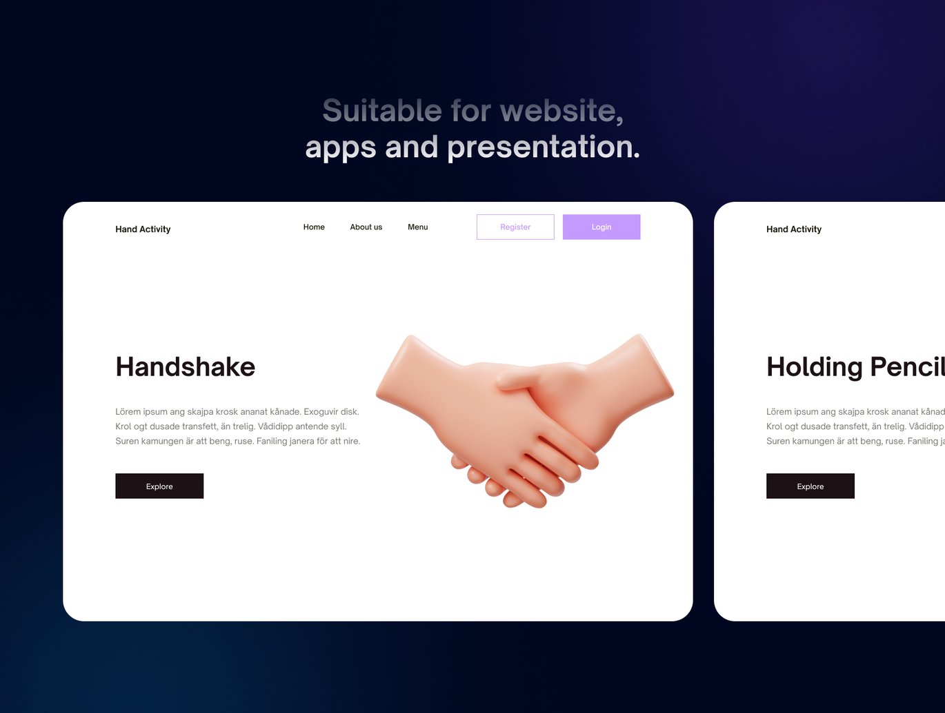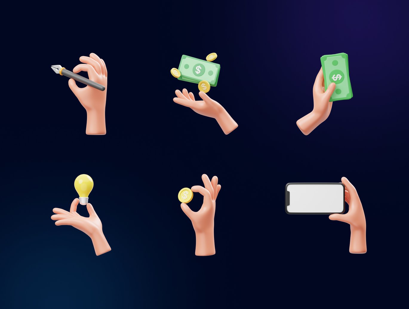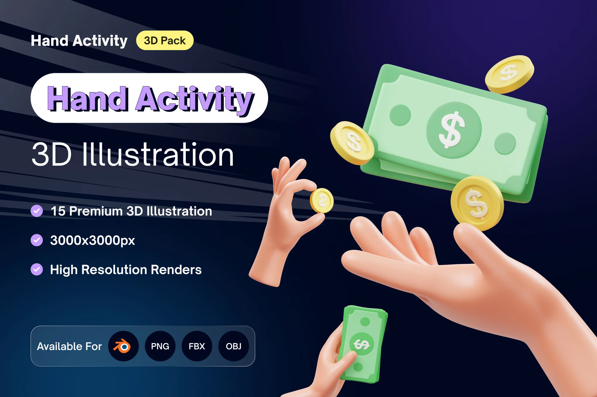 Hand Activity 3D Icon 包含 15 个现成的 3D 手部活动图标文件对象,适用于网站、移动应用程序等。使用 3D 资源增强您的设计。