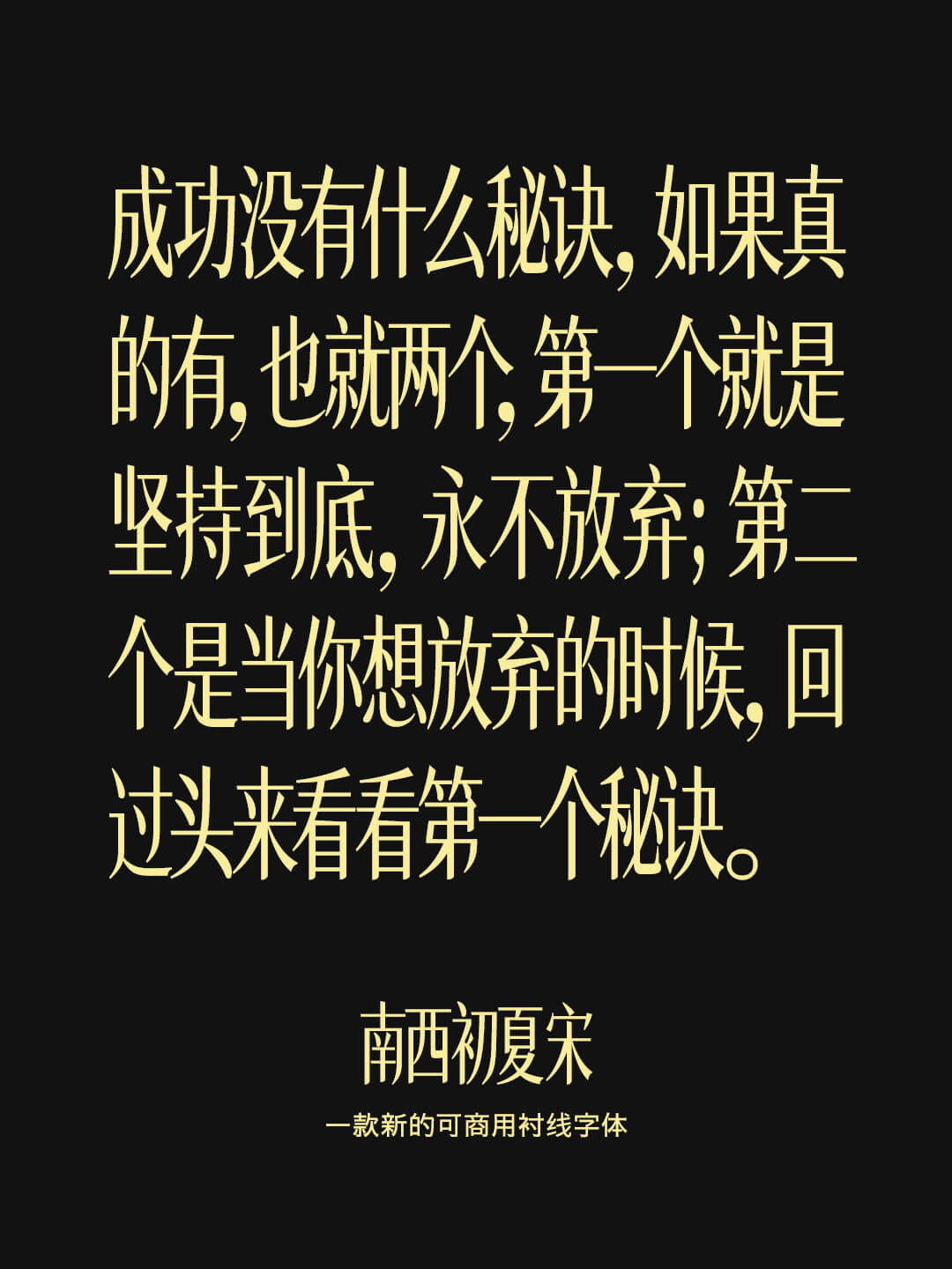 南西初夏宋是一款在经典宋体骨架中注入清新与灵动气息的免费字体。它继承了思源宋体结构严谨、横细竖粗、末端带有饰角的核心特征,保证了印刷般的清晰可读性。
