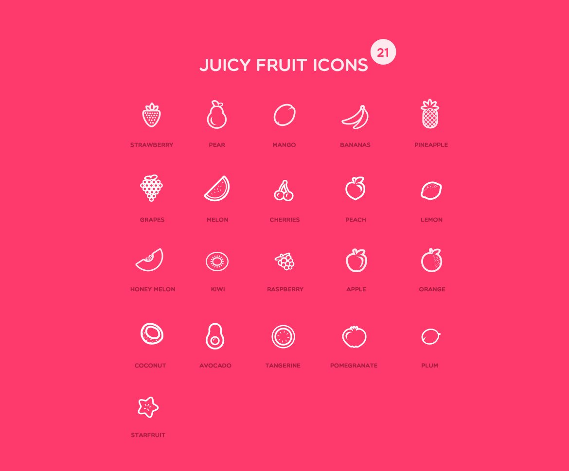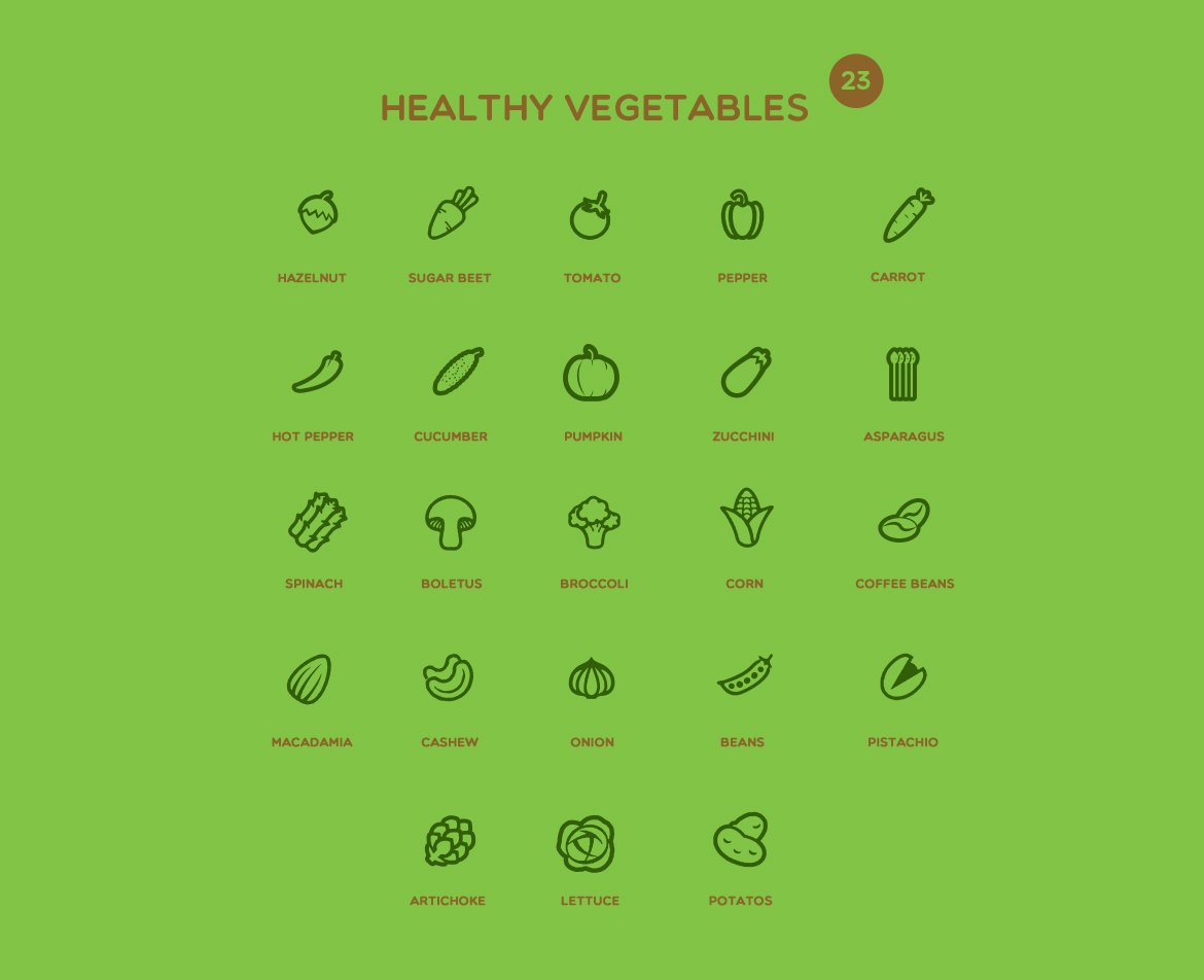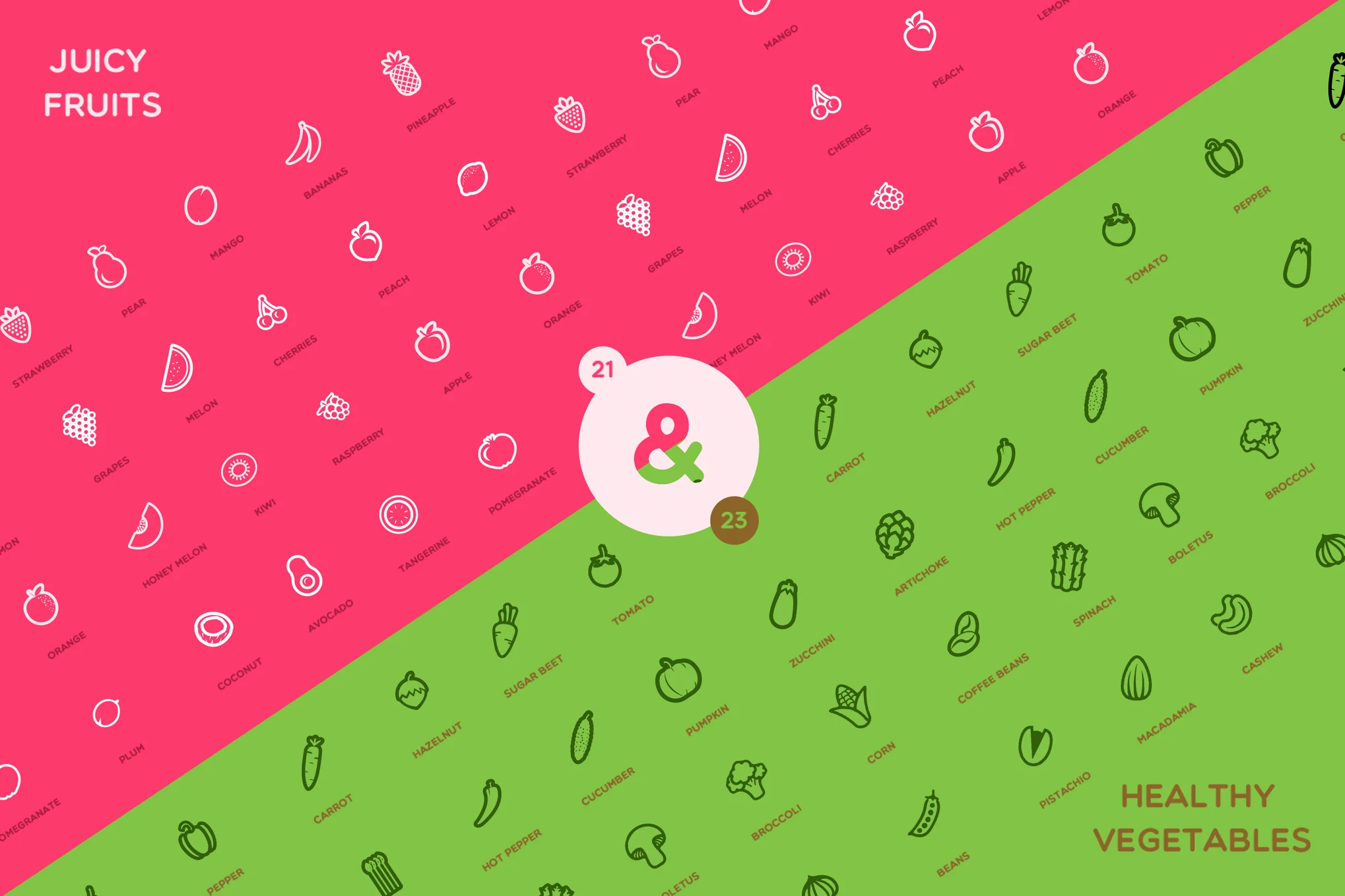 Juicy Fruits & Healthy Vegetables 图标集包括 23 种健康蔬菜和 21 种多汁水果图标。所有图标都是可自定义的矢量形状,可以调整大小为任何大小而不会降低质量。您将获得所有图标作为透明 PNG 文件以及 Adobe Photoshop 的.PSD 文件和Adobe Illustrator 的 SVG 文件。