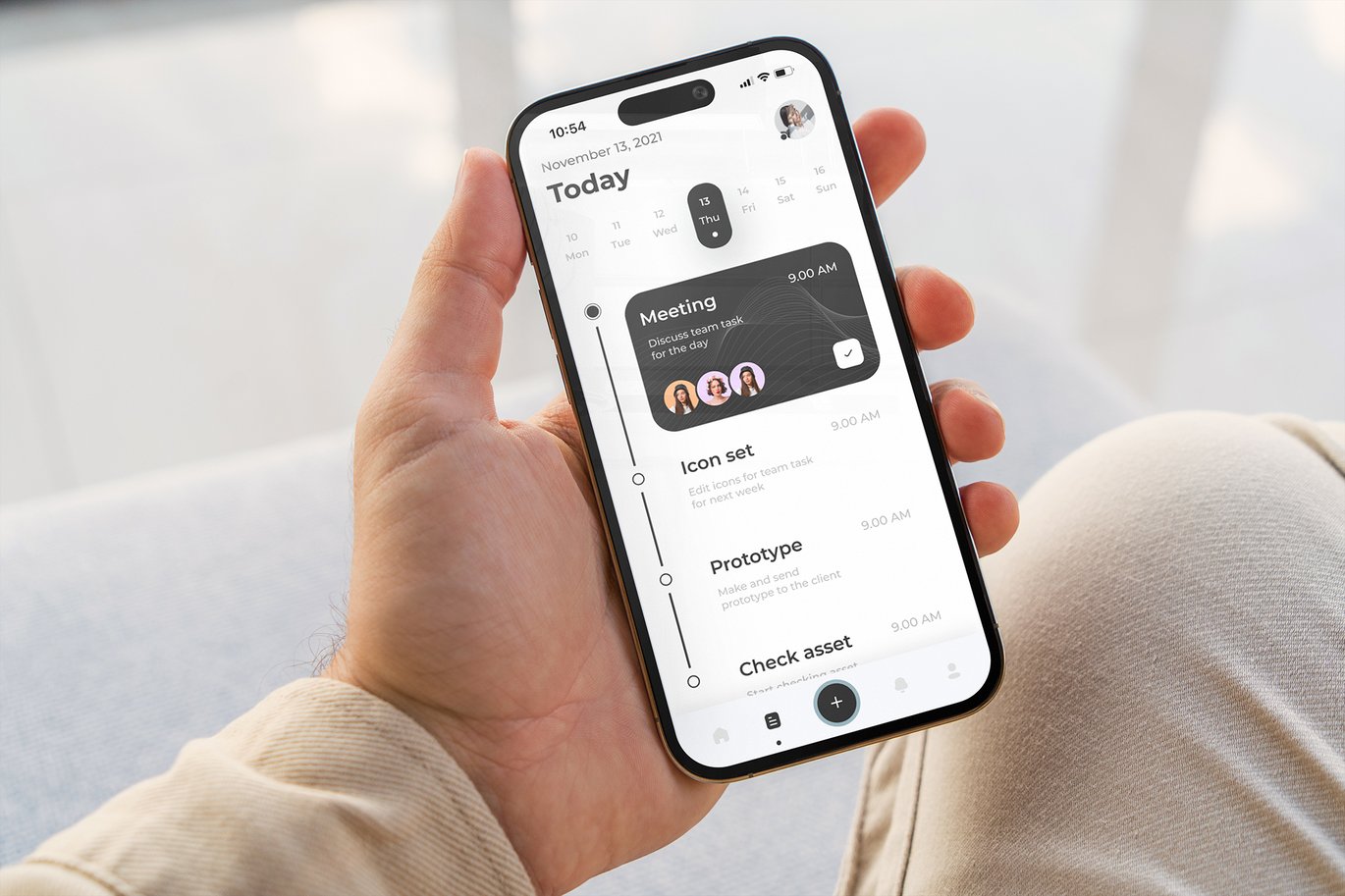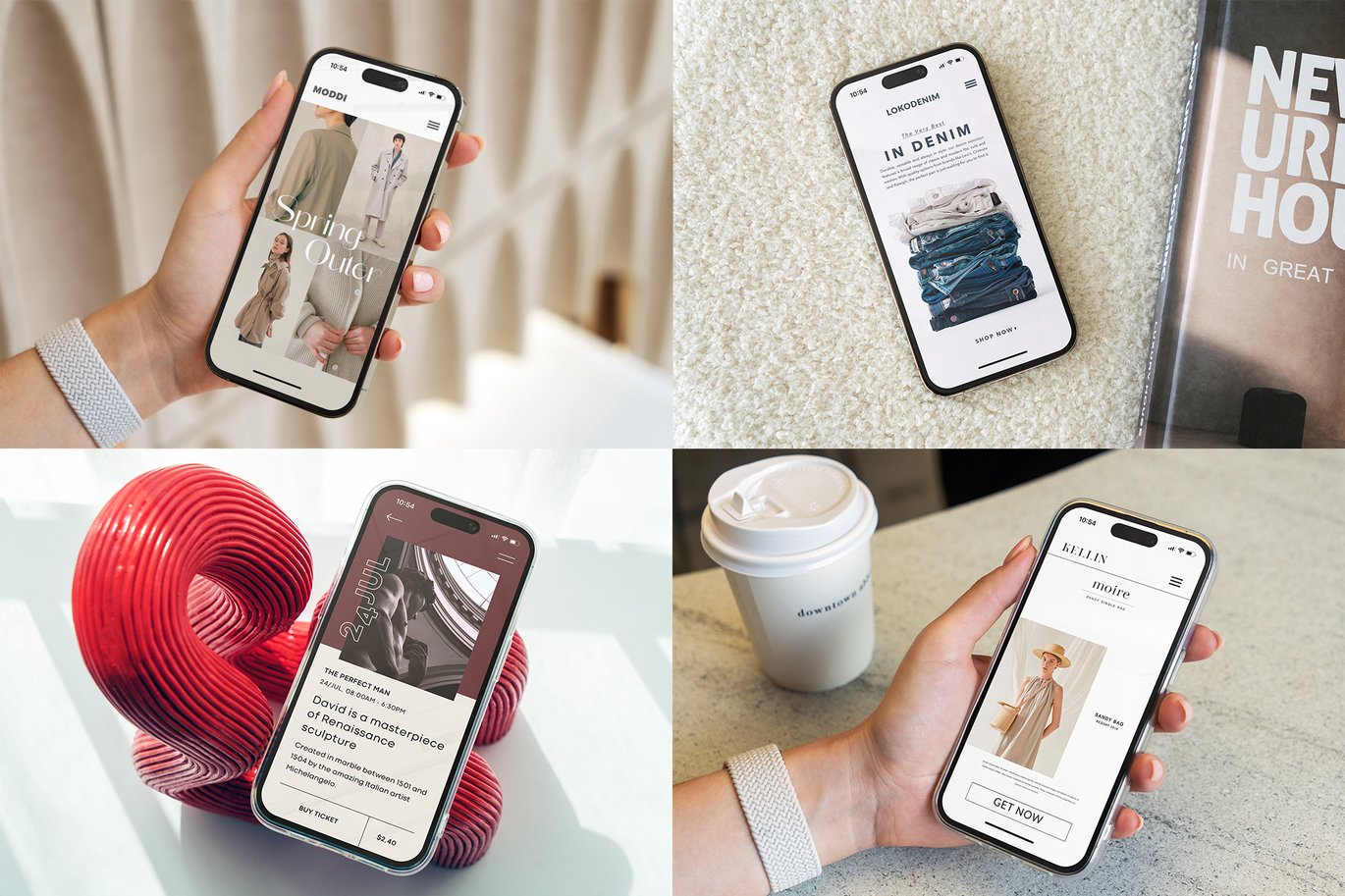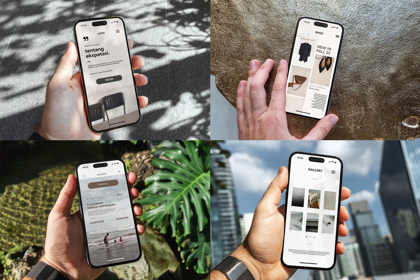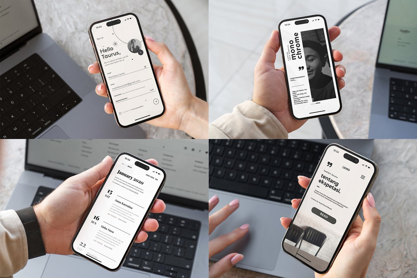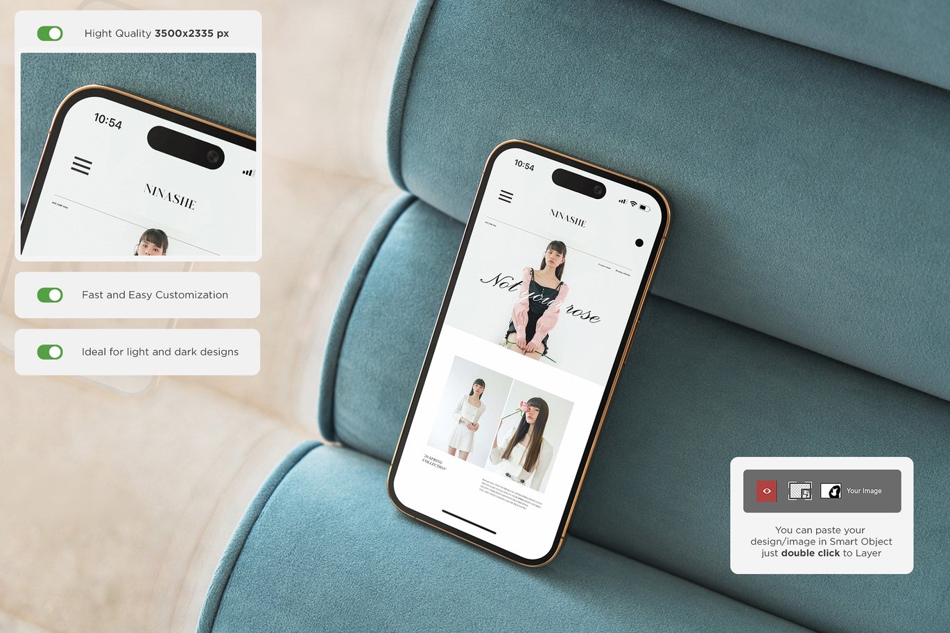 Phone 14 Pro Screen MockUps 在不同位置背景中编辑 iPhone 14 Pro 屏幕模型非常容易。它包含创建项目逼真外观所需的一切。明亮和深色设计的好外观。易于导航,命名图层,友好的 jpg 帮助文件。