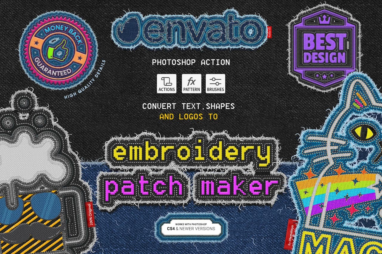 Embroidery Patch Maker Photoshop Action 文件包括 [ 动作 + 画笔 + 图案 + PSD + PNG ] 文件。